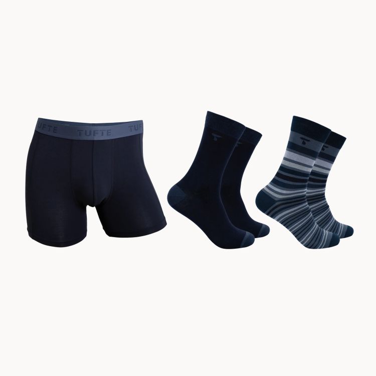 Hverdagspakka! En supermyk boxer og to par sokker til herre fra Tufte – nok til å gjøre deg litt mer bekvem. Praktisk og komfortabel på én gang, og pakket i en fin gaveeske. Boxeren er laget av vårt unike SoftBoost™-materiale, en behagelig miks av bambus lyocell og modalfibre som gjør den usedvanlig myk og komfortabel, samtidig som den er like slitesterk som bomull. At den også er laget på en meget miljøvennlig måte gjør Tufte trusa til en favoritt. Tufte bokseren er Oeko-tex® Standard 100 sertifisert, som vil si at plagget er helse- og allergitrygt. Tufte Crew Sock er en middels høy sokk. Sokken passer like godt i pensko, som i joggesko og støvler. Med forsterkede områder på hæl og tå. En skikkelig anvendelig sokk du alltid kan stole på, hele året gjennom.
