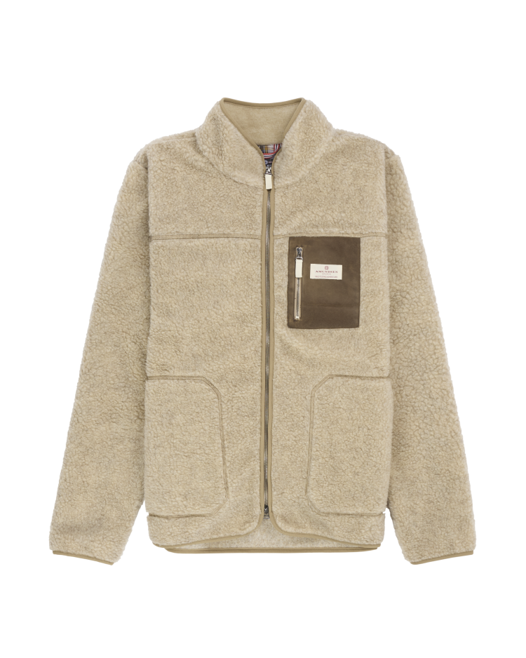 Denne ullfleecejakken kombinerer myk, men slitesterk sherpaullfleece i naturlig ufargede toner som fremhever autentiske saueullfarger og hyller naturens egen palett. Et rutete fôr inni ermene gir komfort og detaljer. Den har en praktisk brystlomme i vokset bomull – den typen detalj som gamle oppdagelsesreisende sydde selv mens de var i leir.