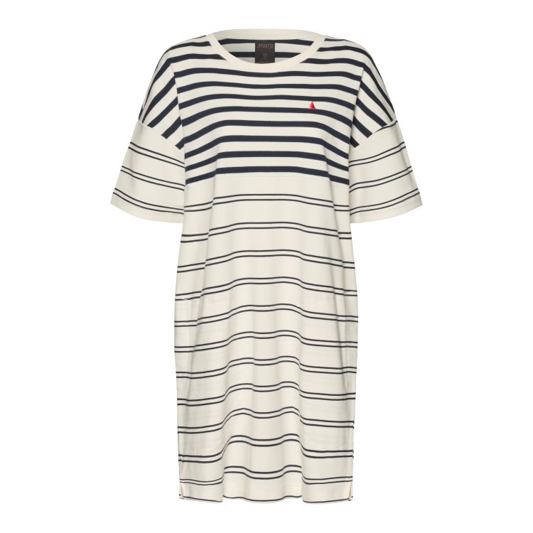 Damekjolen Marine T-skjorte er et avslappet, varmt vær-essensielt plagg med en nautisk vri. Laget av mykt interlock-stoff som gir mer struktur sammenlignet med en vanlig bomulls-T-skjorte. En avslappet silhuett med senkede skuldre gir en enkel passform, og den ribbede runde kragen sikrer komfort mot huden. En «klipp-og-sydd»-teknikk skaper to typer striper for et maritimt inspirert utseende, og praktiske stikklommer gir praktisk bruk på farten. Denne kjolen er ferdig med Mustos broderte Red Boat-emblem, og er et allsidig alternativ for avslappede dager på marinaen eller i byen.