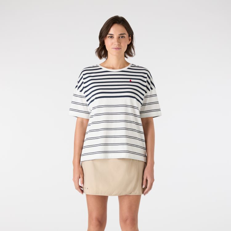 Denne marineblå kortermede t-skjorten for kvinner er lettere i vekt enn andre Musto-t-skjorter for ekstra pusteevne i de varmeste månedene. De senkede skuldrene som går ned til albuene skaper en virkelig avslappet passform som er ideell for avslappede dager borte fra vannet.